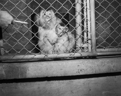 On the first day of his first spring, this pig-tail monkey mother showed her three-month old son the budding trees and blossoming flowers outside their home at Forest Park Zoo. Published in Fort Worth Star-Telegram evening edition March 20, 1952.