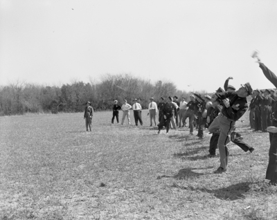 Police Sergeant Howard Gurley, foreground, and other city officers practice tossing tear gas hand grenades at a demonstration of the police department gas arsenal afternoon at the city sewage disposal plant grounds. Published in Fort Worth Star-Telegram evening edition March 20, 1952.