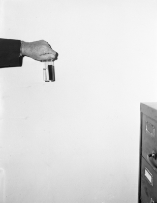The photograph of the test tubes (inset) that was used to do the breath test is shown. The machine was demonstrated in Fort Worth. Published in Fort Worth Star-Telegram evening edition March 21, 1952.