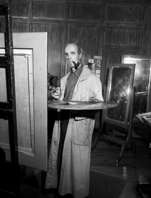Douglas Chandor. Chandor's gardens share his time and interest with his paintbrush - a brush that has portrayed such greats as Roosevelt and Churchill. The image shows Chandor standing in front of a canvas with a paintbrush and a palette in his hands. Published in Fort Worth Star-Telegram morning edition April 7, 1952