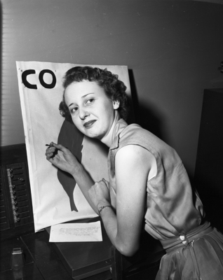 Yyonn Grimmett, 16, a junior at Paschal High School, began working early on a poster to enter in the annual Community Chest art contest, which closes April 30. She is the daughter of Mr. and Mrs. Dale Grimmett, 2230 Mistletoe Avenue. Published in Fort Worth Star-Telegram morning edition, March 23, 1952.