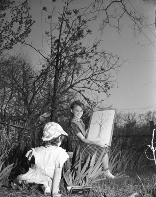 The sun, the trees and the ground are child havens. At the Fort Worth Children's Museum they learn many of their respects for a deeper enjoyment of them. Here Linda Joyce Propst, a young museum artist, sketches a tree in its first spring dress while tiny Phyllis Sue Banks looks on with admiration. Published in Fort Worth Star-Telegram morning edition, March 23, 1952.
