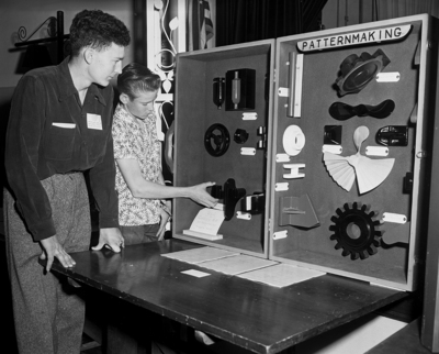 Wade Harral, left, and Piney Hutchinson, Technical High School students, put the last minute touches on an exhibit in the woodworking industries shop. The display was arranged for the annual meeting of the Vocational Industries Club. Five hundred students from Texas high schools registered for the conference,tours and a night dance at Hilton Hotel. Published in Fort Worth Star-Telegram evening edition March 21, 1952.