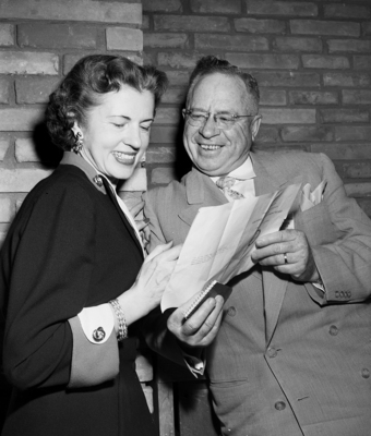 Mrs. Fred T. Bennett of Austin, president of the Southwest Employment Board, and Robert J. Garner of Lubbock, upcoming president, look over the program for their fourth animal convention, which opened at Western Hills Hotel. Published in Fort Worth Star-Telegram morning edition March 22, 1952.