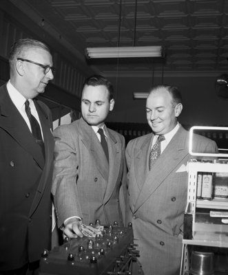 A. C. Swanson, left, of Kansas City, vice president and general sales manager of Western Auto Stores, visited the firm's four Fort Worth stores. Center is Sam Franks, manager of Store No. 4 at Hemphill and Berry, and at right is L. E. Haigwood, Dallas, regional manager. Published in Fort Worth Star-Telegram morning edition March 20, 1952.