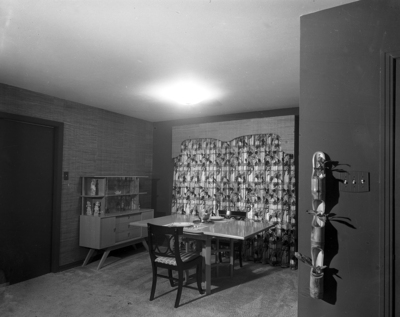 Black and gold are marked accents in the dining chairs. Draperies are in gay print with lime, gray and cranberry predominating. Published in Fort Worth Star-Telegram evening edition, March 25, 1952.
