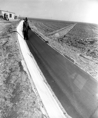 One form of better water use is construction of concrete-lined ditches. J. B. Kirklin stands in one that was recently finished. He believes it will give him 30 percent more water use. Published in Fort Worth Star-Telegram evening edition March 21, 1952.