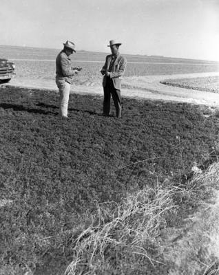 Alfalfa as a rotation crop will help production and soil conditions in the Pecos area, experts believe. Shown here are J. B. Kirklin, right, and Zech Dameron, SCS district conservationist, in Kirklin's field. Published in Fort Worth Star-Telegram evening edition March 21, 1952.