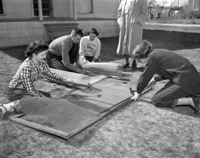 Three members of the Young People Department of First Methodist Church, Pat Conner, Bob McMillion and Lillian Seymour, left to right, repair screens at the North Fort Worth Community Center and Day Nursery. Published in Fort Worth Star-Telegram morning edition, March 23, 1952.