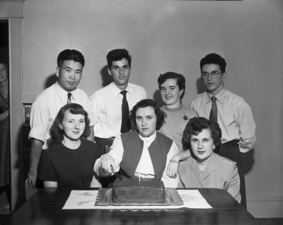 Helping Jean Marshall, behind cake, celebrate her birthday were, seated, Joyce Reinhardt, left, and Sarah Gulledge; standing, Whah Sook Suh of Seoul, Korea; Hans W. Gerhard, Hanover, Germany; Janet Marshall and Kanellos Charalabous, Athens, Greece. Published in Fort Worth Star-Telegram morning edition, March 24, 1952.