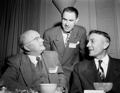 Two out-of-state educators here for a regional conference receive a greeting from Tarrant County Superintendent of Public Instruction O. H. Stowe, center. Left, Dr. Worth McClure of Washington, and right, L. Cameron, Portia, Arkansas.