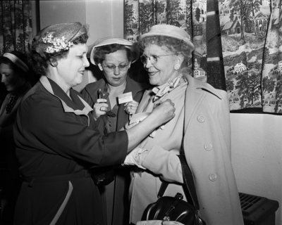 Registering at First Methodist Church for the convention of the Women's Society of Christian Service were, left to right: Mrs. James H. Conley of Jonesboro, Mrs. Charles McDermott of Coleman and Mrs. M. L. Story of Graford. Published in Fort Worth Star-Telegram evening edition, March 25, 1952.