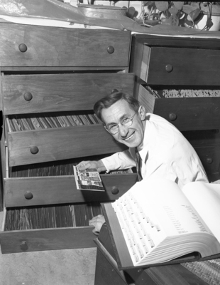 Clarence Moses checks a file card containing five of more than 38,000 match covers he has collected. The drawers behind him are jammed with Moses' hobby items. Published in Fort Worth Star-Telegram morning edition, March 31, 1952.