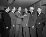 C. R. Smith, American Airlines president, placed a 20 year service pin on the lapel of Raymond E. Buck, southwestern general counsel for American, at a luncheon in the Fort Worth Club. Left to right are M. D. Miller, reginal vice president of sales: Hugh Gallemore, local operations manager: Smith; Buck; W. P. McFail, reginal operations director, and Dr. Hodges McKnight, regional fight surgeon.