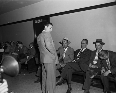 Ernest C. Harris, left, brother of slain Nelson Harris, chased newspaper photographers after this picture was made outside special federal grand jury room at U. S. Courthouse, Thursday morning. L. R. (Tincy) Eggleston, Fort Worth gambler, in hat, second from right, also objected to pictures. Other men in picture were unidentified. Published in Fort Worth Star-Telegram evening edition, March 27, 1952.