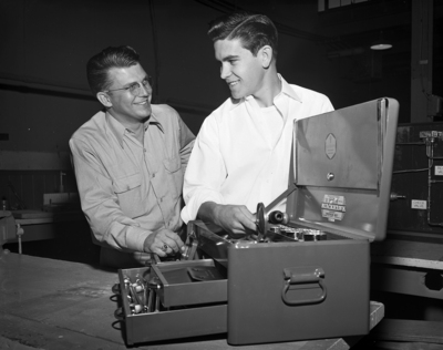 Charles Sinclair, right, Technical High School junior, is shown admiring the set of tools he won last Saturday by winning high point honors in contests held by the Vocational Industrial Clubs of Texas at Technical. At left is his teacher, W. D. Lane. Sinclair, named president of the state group, is the son of Master Sgt. and Mrs. Alex Venski of 100 Seymour St. The tools were donated by Convair Management Club. Published in Fort Worth Star-Telegram evening edition, March 28, 1952.
