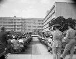 Civilians and military join for dedication services in front of the hospital.