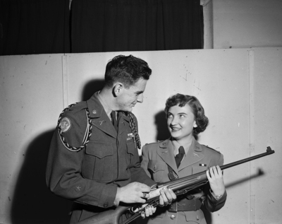 Randy McKenzie, Paschal rifleman who was high point man in the city high school ROTC rifle meet, goes over the nomenclature of his weapon with Ann Sadler, Paschal sponsor. He is the son of Mr. and Ms. J. R. McKenzie, 2605 Ryan Place Dr. She is the daughter of Dr. and Mrs. M. E. Sadler. Published in Fort Worth Star-Telegram evening edition, March 28, 1952.