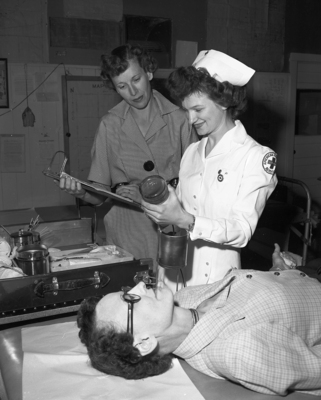 Red Cross Nurse Patty Daughter, right, and Mrs. S. M. Payne, president of the Grapevine 36 Club, stand by as Mrs. W. E. Guest donates a pint of blood. Published in Fort Worth Star-Telegram evening edition, March 28, 1952.