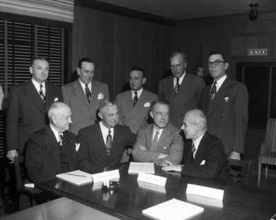 A group photo taken at the Airport Safety Conference held at the Grand Prairie Naval Air Station. Standing from left to right is: Joseph R. Pelich, Raymond Buck, Maury Huffman, William Fuller, and W. O. Jones. Seated from left to right is: Amon Carter, Mayor J. R. Edwards, Carles F. Horne and Lieutenant General James H. Doolittle.