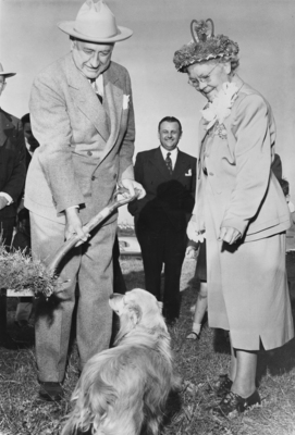 From left to right, Amon G. Carter and Mrs. Lena Pope at groundbreaking ceremony; background, Glen Woodson, nephew of the late C. A. Lupton in whose memory the building (for the Lena Pope Home's Babyland) will be dedicated, and examining the first spade full of earth is Home Superintendent Ki Aldrich's dog. Carter is seen holding the shovel of dirt and looking down at the dog, standing next to Lena Pope.