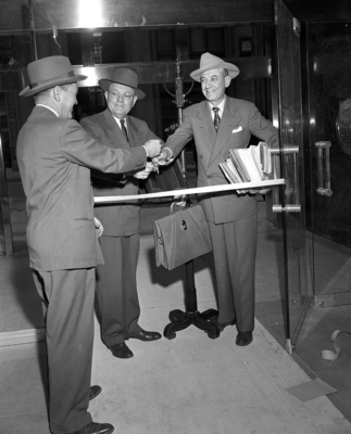 A camera caught the finish of a race of two tenants moving into the new Fort Worth National Bank Building. Shown left to right, Marion Rabun, assistant building manager, handing the office keys to Melvin J. Miller and Harry Phillips. Published in Fort Worth Star-Telegram evening edition March 29, 1952.