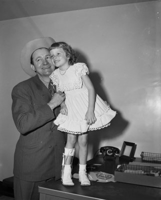 Tiny Jean Young, a 5 year old poster girl for the Easter Seal sale by the Crippled Children's Society of Fort Worth, gave radio entertainer Tex Ritter a warm welcome. Published in Fort Worth Star-Telegram evening edition March 29, 1952.