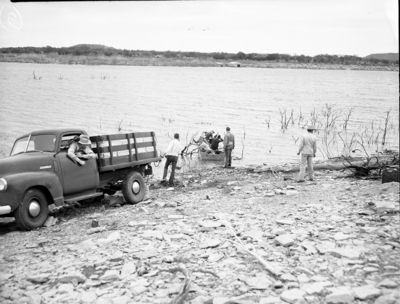 Clearing out the brush for the new boat dock, left, was quite a job; and hauling rocks to bolster the causeway to the "island" was no easy work either. The photograph shows a river and few people standing on the bank of it. A truck is parked on the bank and few people are in the boat. Published in Fort Worth Star-Telegram morning edition April 12, 1952.