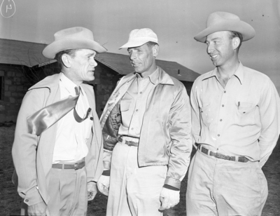 The photograph shows, Left to right, J. B. Payne, O. B. Edmondson, and Jim Wilkerson. The men are standing in front of a house. Published in Fort Worth Star-Telegram morning edition April 12, 1952.