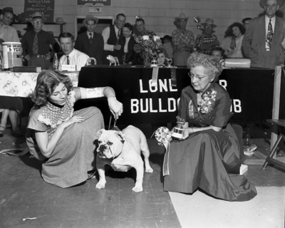 Julie was a proud puppy when she was picked as best dog among 42 entered in the Lone Star Bulldog Club's show. Shown here with her handler, Mrs. W. H. Irvin, 2608 Nies. The dog is owned by Rev. Fred H. M. Smith, 1401 Boyce. Published in Fort Worth Star-Telegram morning edition, March 31, 1952.