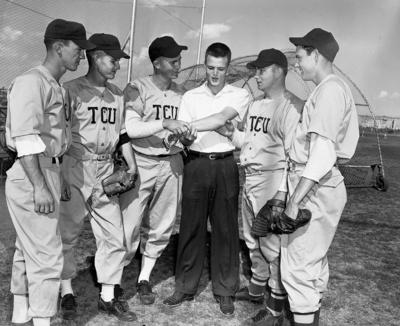 These six Fort Worth youngsters helped Texas Christian University's baseball freshmen to a successful year. Left to right, Chuck Spencer and Joe Vaughn of Arlington Heights, Leslie Mattinson of North Side, Eldridge Miles of Carter Riverside, Bob Miller of Arlington Heights, and Tommy Hill, formerly of Burleson. Published in Fort Worth Star-Telegram evening edition, March 28, 1952.