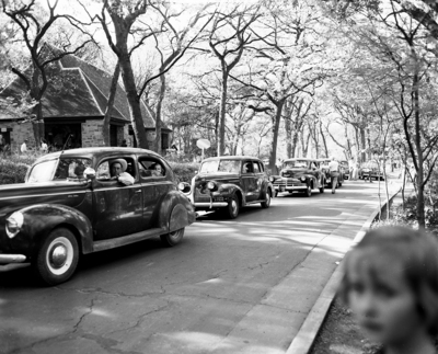 The largest crowd of the year turned out at Forest Park Zoo and caused this jam around the chimpanzee cage. Lower photo shows cars, bumper-to-bumper, waiting to get into the parking lot off Forest Park Drive. Parking space was practically non-existent in the zoo area.