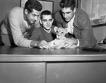Catcher Steve Lembo, business manager Bill Eberly and first baseman Wayne Belardi, left to right, get together for the first time at La Grave Field with "Raunchy Roscoe", African lion cub that will be the Fort Worth team mascot. Published in Fort Worth Star-Telegram evening edition, April 03, 1952.
