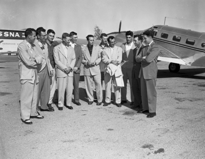 Eleven of the 17 Cats who came to Fort Worth by plane from Florida training camp pause at airport for a picture. Left to right, are Bill Hunter, James Zanitka, James Melton, Ashton Heckel, Odbert Hamric, Ralph Butler, Kenesaw Mountain Landis Hemphill, Ted Bosaick, Ted Del Guerico, Manager Bobby Bragon and Joe Torpey. Three others came by plane and four drove cars. Published in Fort Worth Star-Telegram morning edition, April 03, 1952.