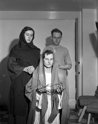 Three members of the cast of "The Upper Room" are, left to right, Dorothy Gross, John Ramsey and Walter Paquette. There are principal performers in the play presented by the Senior Catholic Youth Organization, in the Our Lady of Victory Auditorium. Published in Fort Worth Star-Telegram evening edition April 3, 1952.