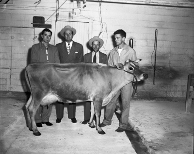 This is one of the 25 Texas-bred Jerseys going to Arabia as foundation stock for a dairy improvement program financed by the Arabian government to demonstrate the merits of quality cattle. Standing left to right are Charles Kirkham, Sam Logan, Dr. Joe Mims, and James Robert Simons. Kirkham, Mims and A. T. Hays (not in picture) will accompany the cattle. Published in Fort Worth Star-Telegram evening edition April 3, 1952.
