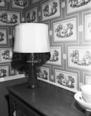 Cherry wood and gleaming brass are combined in the base of a table lamp, styled for provincial decor. Published in Fort Worth Star-Telegram evening edition April 3, 1952.