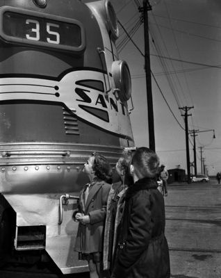 Three youngsters from Era, Cooke County, gaze at the Santa Fe's Texas Chief which brought them and their fellow first graders here from Gainsville. They are, left to right, Mary Louise Anthony, Jane Hickerson, and Kenneth Burton McClendo. Published in Fort Worth Star-Telegram morning edition April 5, 1952