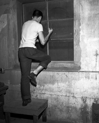 Unidentified teenager used in juvenile crime scene. Teenager seems to be escaping through the windows. Published in Fort Worth Star-Telegram evening edition April 4, 1952.