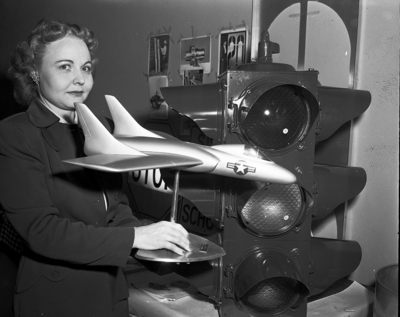 Mrs. Emmadean Berry, manager of the Chamber of Commerce, is sponsoring the first annual Grand Prairie Industrial Show. Berry is holding an exact replica of Chance Vought Aircraft Company's jet twin-engine F7U-3 Cutlass tailless plane. Published in Fort Worth Star-Telegram evening edition April 4, 1952.