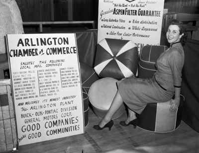 A feature exhibit at Arlington Industrial Show held in John A. Kooken School gym was a display of excelsior used in manufacture of home hassocks which are being given a trial by Mrs. Dorothy Wallace, secretary of the Arlington Chamber of Commer, sponsor of the show. The exhibit is the Western Aspen Excelsior Manufacturing Company display. Published in Fort Worth Star-Telegram evening edition April 4, 1952.