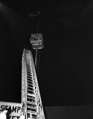 Barry Lloyd, radio station comedian who hopes to set a new flag pole sitting record at La Grave Field, waves from his small perch after climbing there via fire truck. Published in Fort Worth Star-Telegram morning edition May 06, 1952.