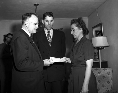 Mrs. Henry E. Cleveland, widow of slain city detective, was presented a check for $8,103 in public donations by Police Chief R. R. Howerton, left. Standing by is Deputy Chief Cato Hightower. Published in Fort Worth Star-Telegram evening edition April 5, 1952.
