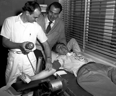 Richard Dalton, vice president of the Fort Worth Jaycees, was first contributor Saturday to the blood bank at St. Joseph's Hospital being built for Jaycees and their families by members of the organization. Watching is Joseph Colosimo, chairman of the blood bank committee, and the technician, C. E. Kratz. Published in Fort Worth Star-Telegram evening edition April 5, 1952.