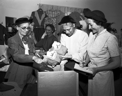 Members of St. Mary's Council of the National Council of Catholic Women Monday were packing new clothing for needy European children. They are, left to right, Miss Lumenia LeMay, Mrs. E. E. Leonard, Mrs. Walter H. Phillips, and Mrs. W. H. French. Published in Fort Worth Star-Telegram evening edition April 7, 1952.