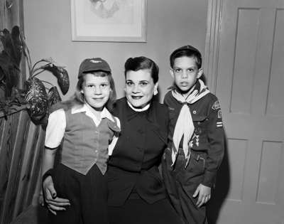 Mrs. Gus Bates Jr. will be installed as president of the Social Service Section of the Junior Women's Club at a luncheon to be held at Colonial Country Club. Mrs. Bates is shown with her children, Peggy and Gus Tom. Published in Fort Worth Star-Telegram evening edition April 7, 1952.