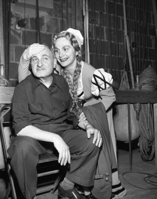 Uta Graf, the "Marguerite", will enact her part despite the fact she has lost her voice. She comforts stage manager, Armando Agnini, in the depths of dress rehearsal. Published in Fort Worth Star-Telegram morning edition March 22, 1950.