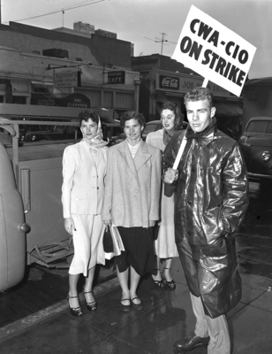Western Electric picket lines at Southwestern Bell Telephone offices were stop-work whistle for unionized operators. Refusing to cross by Dwight Wall's picket sign into the office are, left to right, Mrs. C. R. Harrison, Mrs. Jimmie Ledbetter, and Miss Emily Richardson. The man is not identified. Published in Fort Worth Star-Telegram morning edition, April 10, 1952.