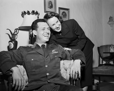 Mrs. John C. Friend gives her husband a big hug as they make plans for a new home at Bryan Air Force Base, where Lieutenant Friend will be an advanced jet pilot instructor. He returned after serving for 10 months in Korea. Published in Fort Worth Star-Telegram evening edition April 8, 1952.
