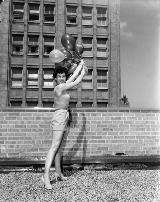 Shirley Beech releases a handful of balloons with tickets inside to attend a kids' show. Published in Fort Worth Star-Telegram evening edition April 8, 1952.